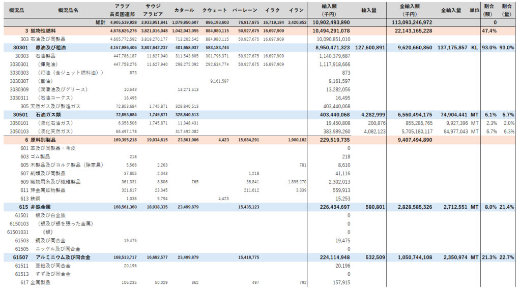 2025年 日本のホルムズ海峡内諸国からの輸入額詳細(概況品別)(千円)