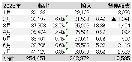 2025年1月~7月 ベトナムからの輸出入、貿易収支(月次)(百万ドル)