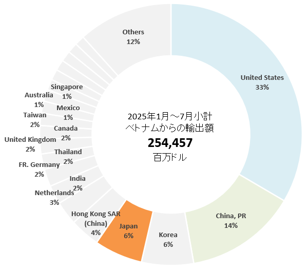 2025年1月~7月小計 ベトナムからの輸出額を国別でみると、アメリカ向けが851億ドル(33%)でトップ、次いで、中国向けの350億ドル(14%)、そして、韓国向けの163億ドル(6%)となっている。日本向けは151億ドル(6%)で4位となっている。