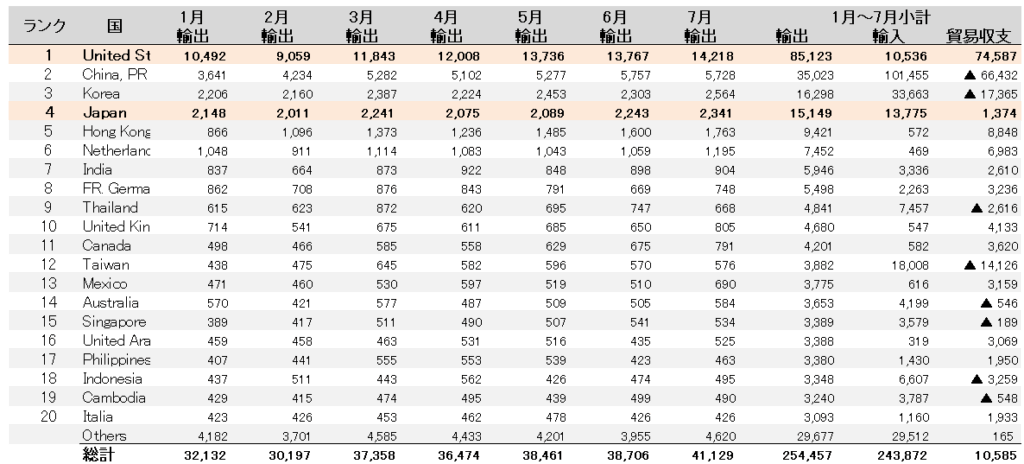 2025年1月~7月 ベトナムからの輸出額(国別)(百万ドル)