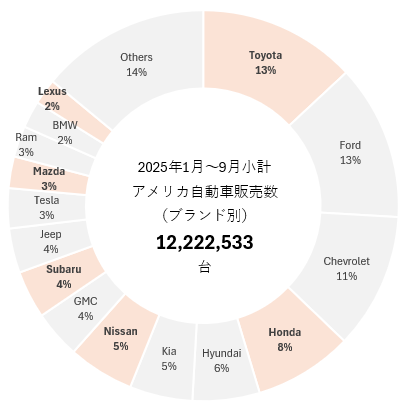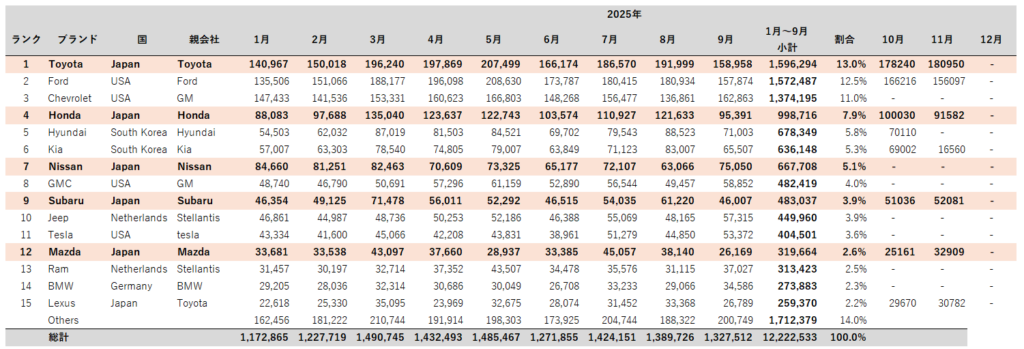 2025年1月~9月小計をブランド別でみると、Toyotaが160万台(13%)でトップ。次いで、Fordの157万台(13%)、そして、Chevroletの137万台(11%)と続く。