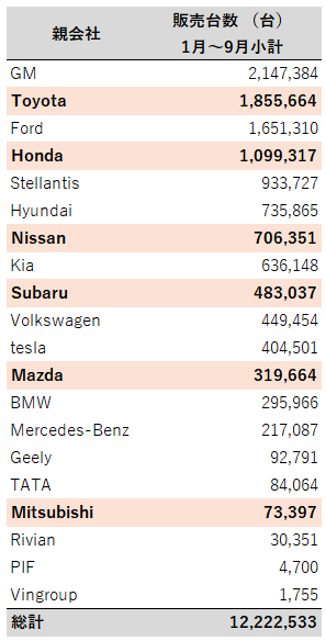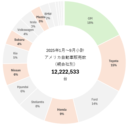 2025年1月~9月小計を親会社別でみると、GMが215万台(18%)でトップ。次いで、Toyotaの186万台(15%)、そして、Fordの154万台(14%)と続く。