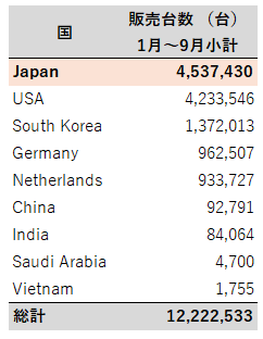 2025年1月~9月小計を国別でみると、日本が454万台(37%)でトップ。次いで、アメリカの423万台(34%)、そして、韓国の137万台(11%)と続く。