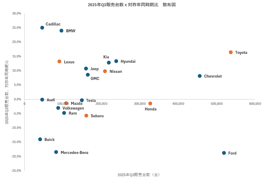 2025年Q3の販売台数と対前年同時期変動率を散布図にしてみると、販売台数が多く、かつ成長しているブランドととしては、Toyota、Chevroletといえる。