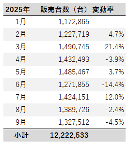 2025年9月の販売台数は133万台で、8月の139万台から4.5%減少している。2025年1月~9月小計では1,222万台。