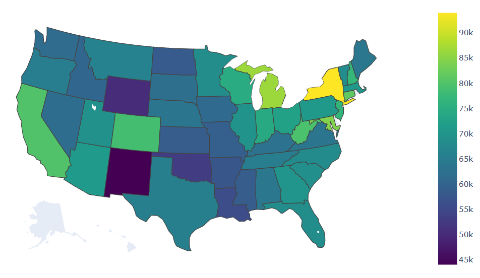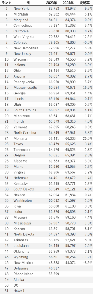 2024年の自動車部品製造労働者コストで一番高かったのはニューヨーク州の93,942ドルで、唯一、年平均9万ドルを超えている。次にミシガン州の86,444ドル、そして、メリーランド州の84,374ドルと続く。
