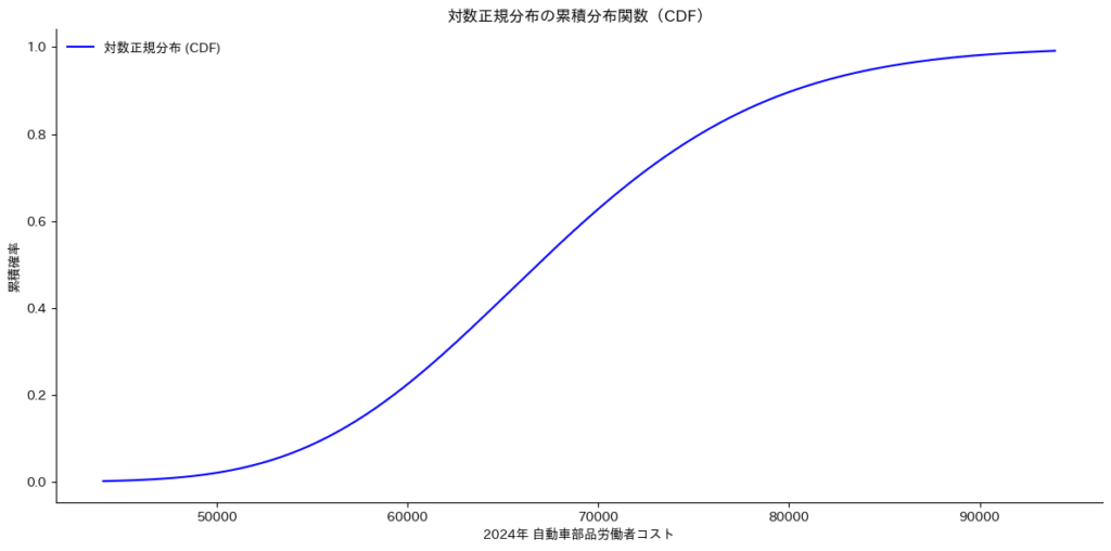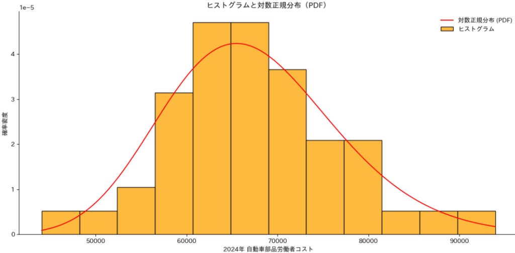 ヒストグラムを簡易的に対数正規分布で近似してみると、コストが8万ドル以上になる確率は約10%、7~9万ドルの範囲に入る確率は約35%となった(あくまで簡易的な近似)。