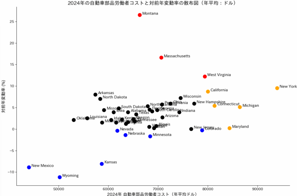 アメリカ 自動車部品製造労働者コスト(州別) 2024年