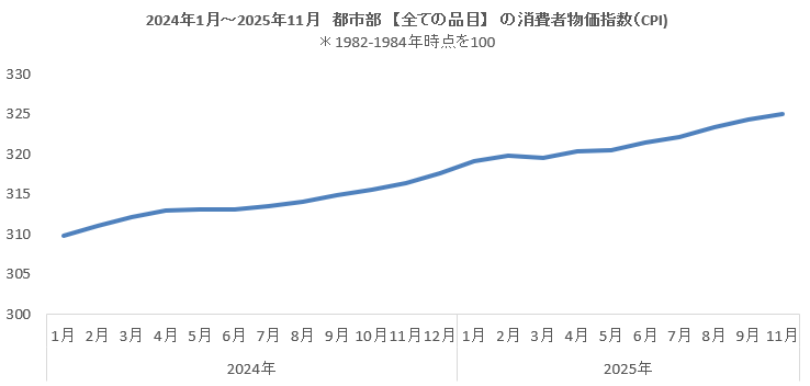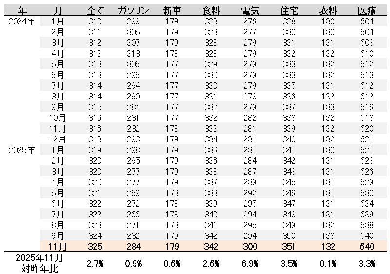 全ての品目では、2025年11月のCPIは325で、対昨年同月比で2.7%上昇。2024年1月以降、常に上昇傾向(2024年1月~2025年11月間の月次平均変動率0.2%上昇)。