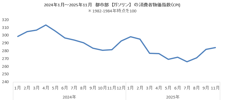 ガソリンでは、2025年11月のCPIは284で、対昨年同月比で0.9%上昇。2025年春から夏にかけて下降したが、8月以降上昇に転じている(2024年1月~2025年11月間の月次平均変動率0.2%減少)。