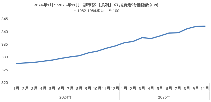 食料では、2025年11月のCPIは342で、対昨年同月比で2.6%上昇。2024年1月以降、常に上昇傾向(2024年1月~2025年11月間の月次平均変動率2.6%)。これが消費者にとっては、一番物価高に感じる品目ではないかと思われる。