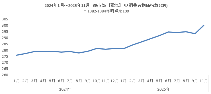 電気では、2025年11月のCPIは300で、対昨年同月比で6.6%上昇。2024年1月以降、常に上昇傾向(2024年1月~2025年11月間の月次平均変動率0.4%)。これも物価高を感じる品目と思われる。