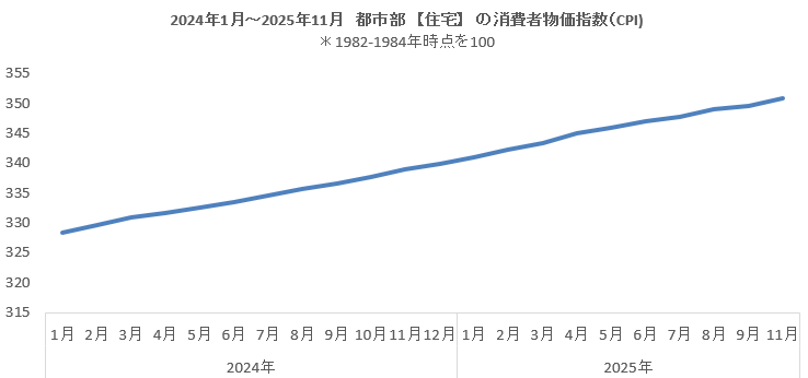 住宅では、2025年11月のCPIは351で、対昨年同月比で0.3%上昇。2024年1月以降、常に上昇傾向(2024年1月~2025年11月間の月次平均変動率0.3%)。