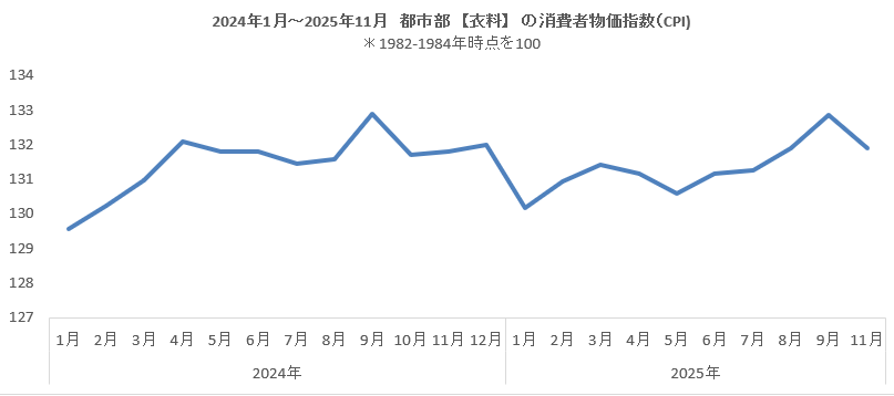 衣料では、2025年11月のCPIは132で、対昨年同月比で0.1%上昇。2025年1月に下降したが、それ以降再上昇に転じている(2024年1月~2025年11月間の月次平均変動率0.1%)。
