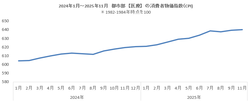 医療では、2025年11月のCPIは640で、対昨年同月比で3.3%上昇。2024年1月以降、常に上昇傾向(2024年1月~2025年11月間の月次平均変動率0.3%)。これも消費者にとって、物価高を感じる品目と思われる。