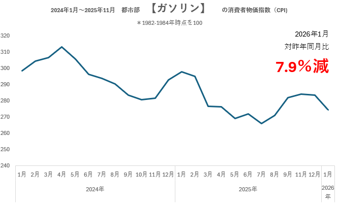 ガソリンでは、2026年1月のCPIは275で、対昨年同月比で7.9%の大幅下落。2025年春から夏にかけて下降、8月以降上昇に転じていたが、11月、12月と高止まり後、1月に下落してきている(2024年1月~2026年1月間の月次平均変動率0.3%減少)。
