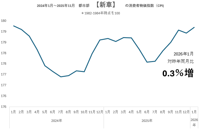 新車では、2026年1月のCPIは179で、対昨年同月比で0.3%とほぼ横ばい。2025年6月、7月に下降したが、8月以降上昇に転じている(2024年1月~2026年1月間の月次平均変動率0.0%)。