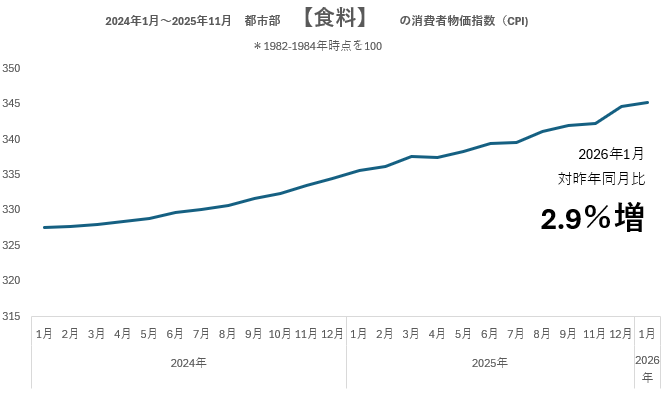 食料では、2026年1月のCPIは345で、対昨年同月比で2.9%上昇。2024年1月以降、常に上昇傾向(2024年1月~2026年1月間の月次平均変動率0.2%)。これが消費者にとっては、一番物価高に感じる品目ではないかと思われる。