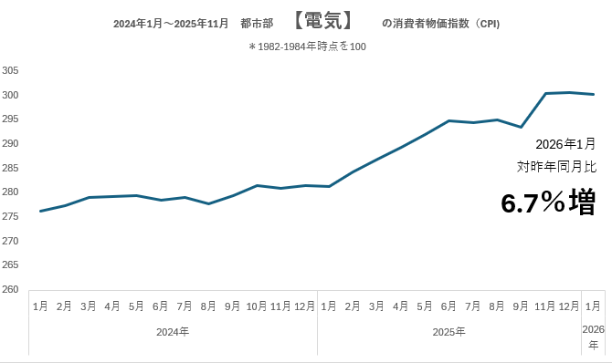 電気では、2026年1月のCPIは300で、対昨年同月比で6.7%上昇。2028月、9月に、一旦高止まりしたが、11月以降、再上昇傾向にある(2024年1月~2026年1月間の月次平均変動率0.3%)。これも物価高を実感する品目と思われる。