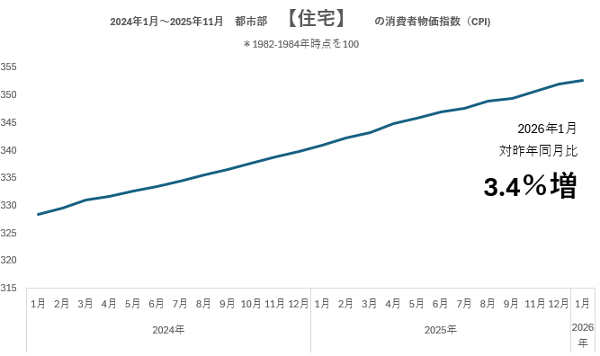 住宅では、2026年1月のCPIは353で、対昨年同月比で3.4%上昇。2024年1月以降、常に上昇傾向(2024年1月~2026年1月間の月次平均変動率0.3%)。