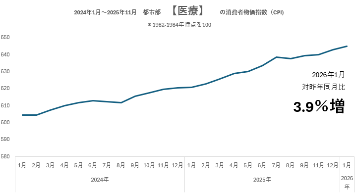 医療では、2026年1月のCPIは645で、対昨年同月比で3.9%上昇。2024年1月以降、上昇傾向(2024年1月~2026年1月間の月次平均変動率0.3%)。これも消費者にとって、物価高を感じる品目と思われる。