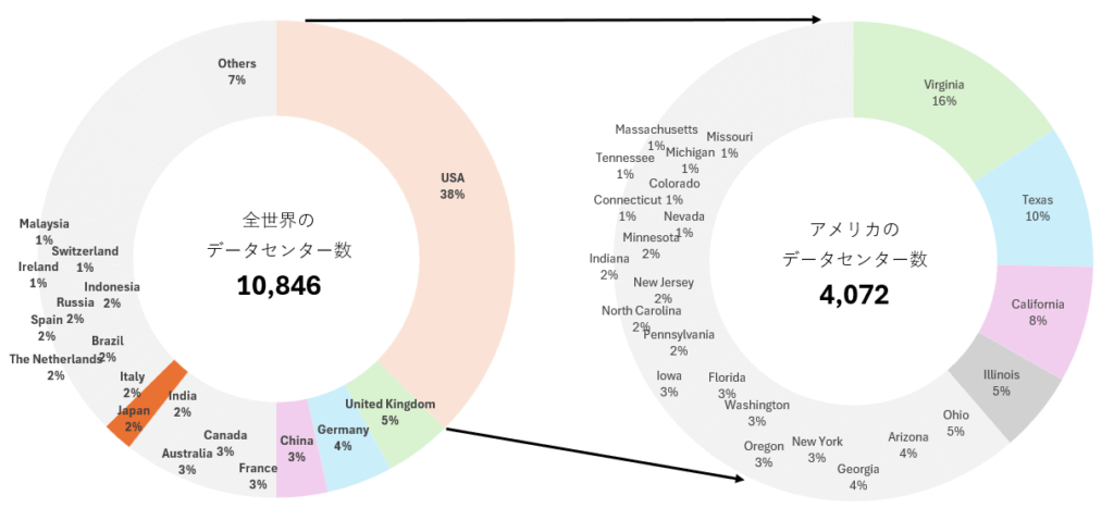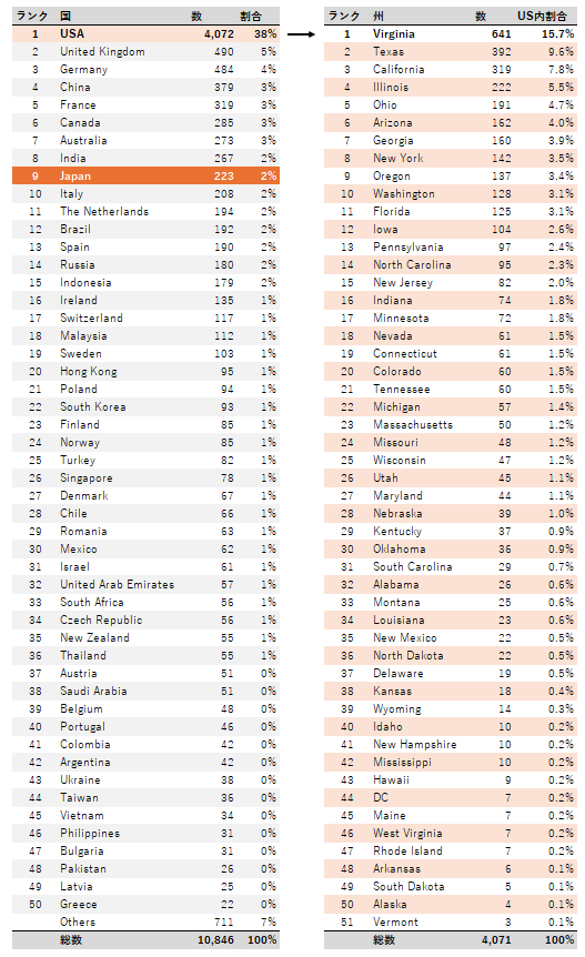 data center.comによると、今日時点の全世界のデータセンター数は10,846。うち、アメリカが4,071(38%)で圧倒的に多く、次に、イギリスの490(5%)、ドイツの484(4%)と続く。日本は223(2%)で9位であった。アメリカの内訳として、州別にみると、バージニア州が641(16%)で一番多く、次いで、テキサス州の392(10%)、そして、カリフォルニア州の319(8%)と続く。今後、ますます、これらは増えていくのではと思われる。