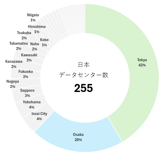 日本のデータセンター数255ケ所の内訳をみると、