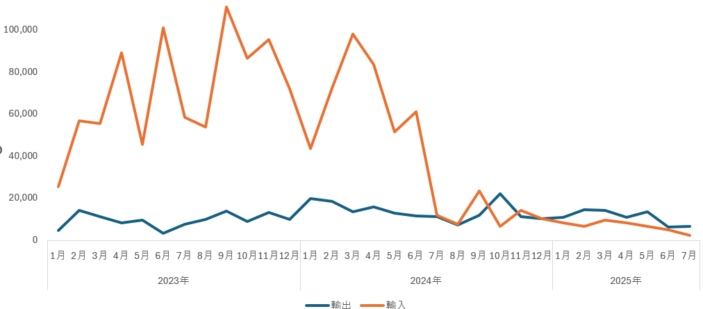 月次でみると、2024年3月以降、輸入が急激に減少している。