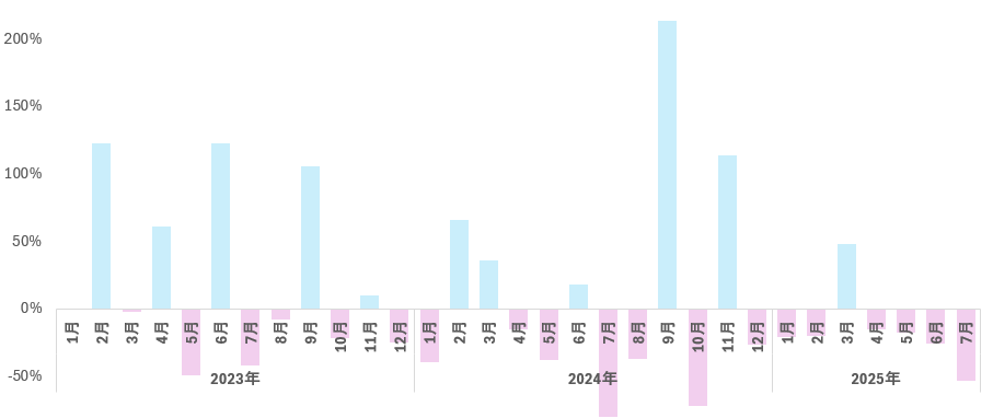 2023年1月~2025年7月 アメリカの無人機(ドローン)輸入の対前月比変動率(%)
