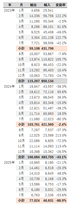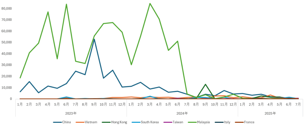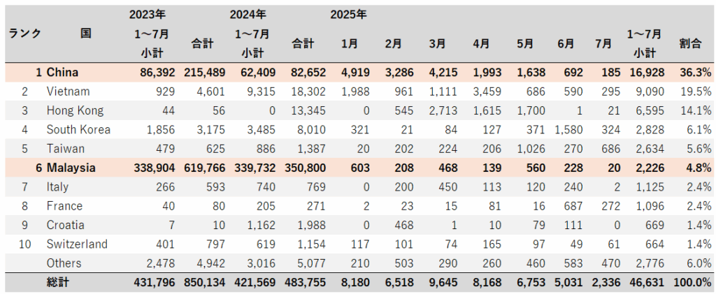 一方、輸入では、2025年1月~7月小計では、中国からの輸入が16,928台(36.3%)と一番多く、次にベトナムからの9,090台(19.5%)、そして、香港からの6,595台(14.1%)であった。