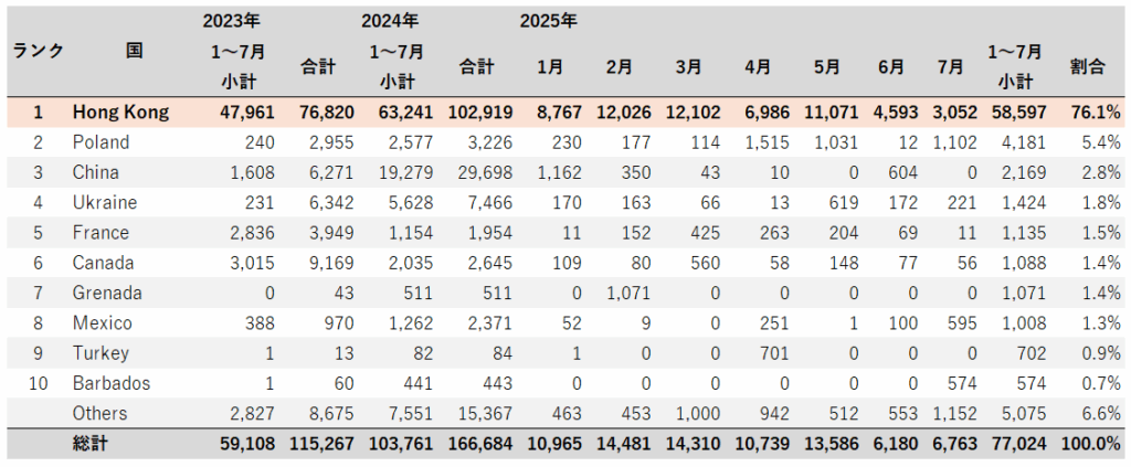 次に、国別でみると、2025年1月~7月小計で、アメリカからの輸出では、香港向けが58,597台(76.1%)で圧倒的に多い。香港経由の場合、中国本土のみならず、他国にも流れている可能性もある。ウクライナ向け輸出は、2,169台(2.8%)であった