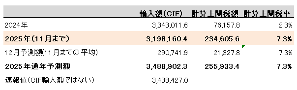 - 2025年11月末までの計算上関税率は7.3%なので、12月もその率と推定すると、2025年通年での計算上関税推定額は2,559億ドルとなる(対2024年比2236.1%の大幅増加)