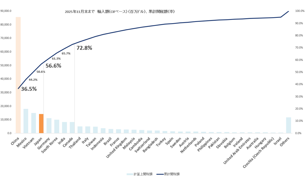 - 2025年11月末までの日本からの輸入額は1,362億ドル、計算上関税額は142億ドル、計算上関税率は8.9%