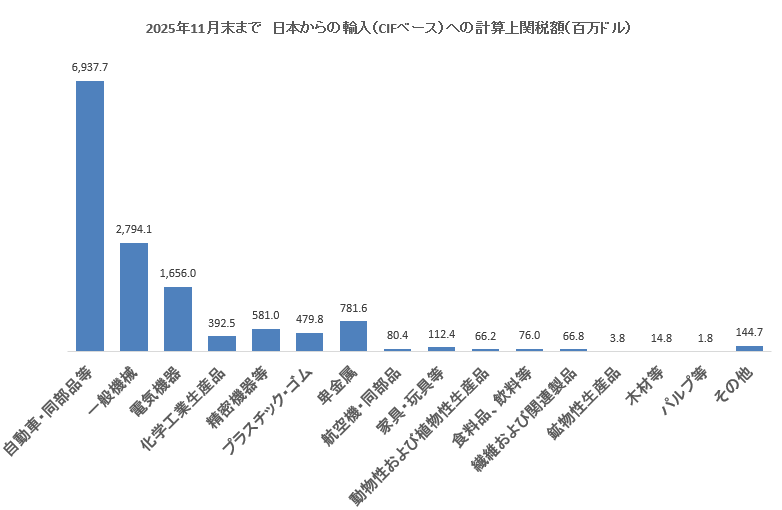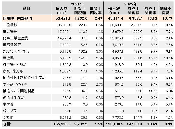 - 品目別では、自動車・部品の2025年11月末までの計算上関税額は69億ドルで、計算上関税率は16.1%に及ぶ
