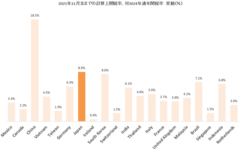 2025年11月までの関税率と2024年通年の関税率の差をみてみると、