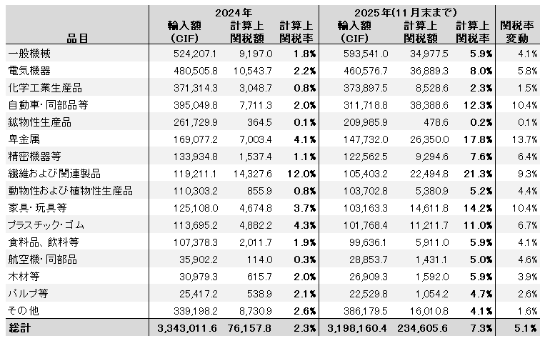 2024年通年、2025年11月末まで 輸入額(CIFベース)(百万ドル)、計算上関税額(百万ドル)、計算上関税率(%)(品目別)