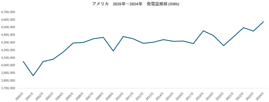 アメリカの2024年の発電量は4,573TWhで、2023年の4,453TWhから2.7%増加している。2000年以降の推移をみると、2028年に4,455TWh(対前年比3.9%増)を記録した後、コロナ禍で2020年に大きく減少。2021年以降は(2023年以外)、年平均約2.7%で増加傾向にある。