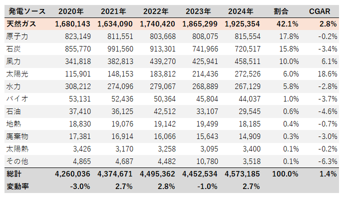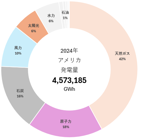 2024年の発電ソース別割合では、天然ガスが1,925TWh(42%)でトップ、次いで、原子力の816TWh(18%)、そして、石炭の721TWh(16%)と続く。
