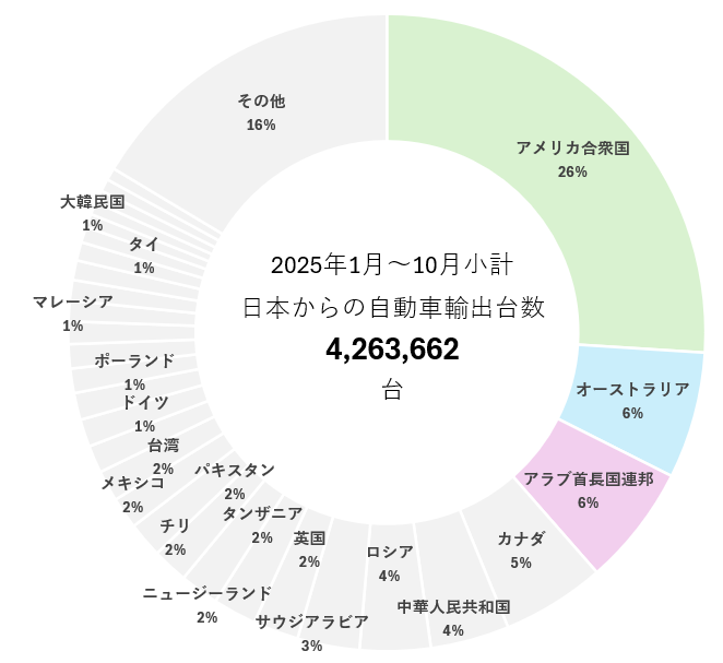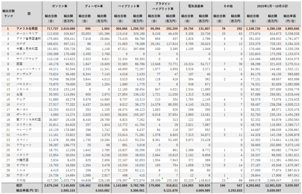 日本の2025年1月~10月累計の自動車輸出台数は426万台、輸出額は12兆9,615億円、単純に輸出額を台数で割った輸出単価は304万円/台、1月~5月累計の平均輸出単価が334万円/台であったことから、30万円(9%)減少していることになる。輸出先でみると、アメリカ向けが111万台(4兆2,862億円)で26%とダントツで多く、次に、オーストラリア向けの27万台(9,147億円)の6%、そして、アラブ首長国連邦向けの26万台(4,599億円)の6%であった。