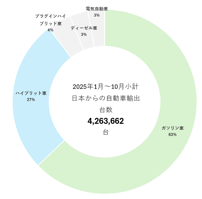 次に、種類別でみると、ガソリン車が268万台(63%)で一番多く、次いで、ハイブリッド車の114万台(27%)と、この2種類で輸出の90%を占めている。