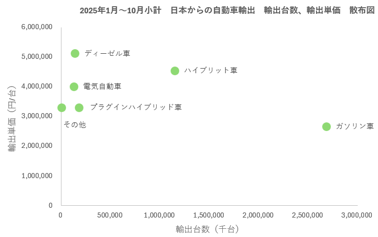 2025年1月~10月 日本からの自動車輸出台数(台)、輸出額(百万円)種類別