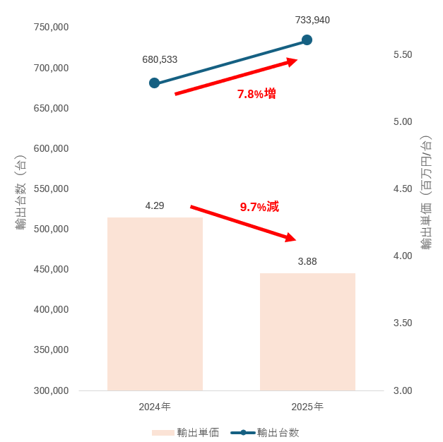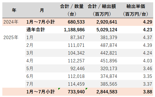 2024年(1月~7月小計)と2025年同時期の輸出台数(台)、輸出単価(百万円/台)の推移