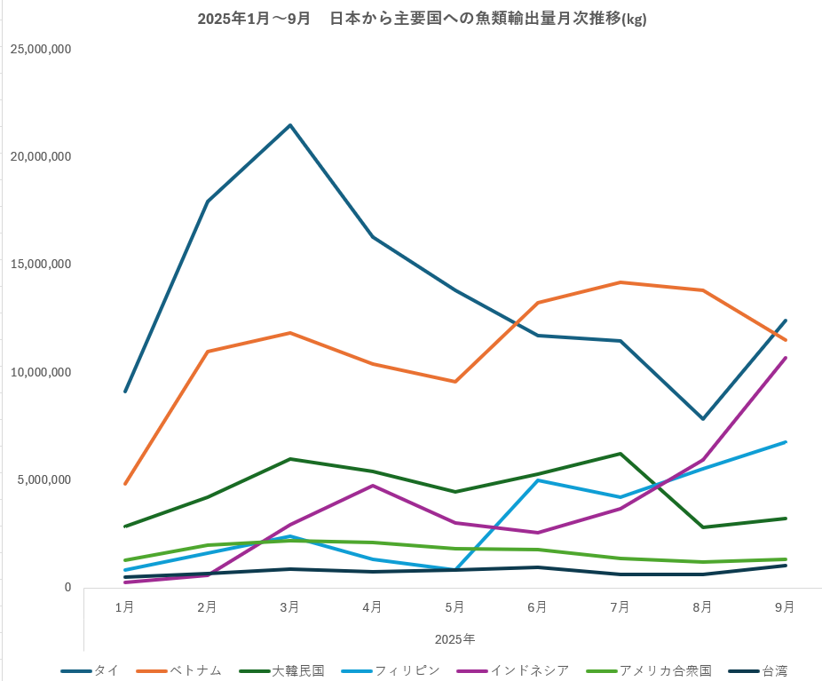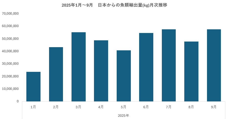 2025年1月から9月までの日本から世界各国への魚類輸出額小計は2,067億円(42.9万トン)で、2024年通年輸出額2,205億円(38.6万トン)を輸出量では既に上回っており、輸出額も上回ると予測できる。月次の輸出量(kg)でみると、8月に若干減少したが、6月以降、安定して月5.5万トン前後で推移している。