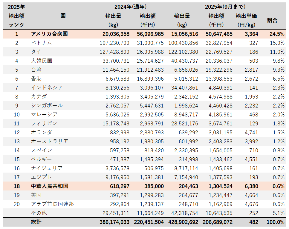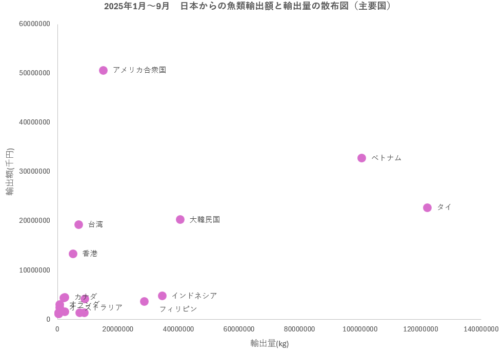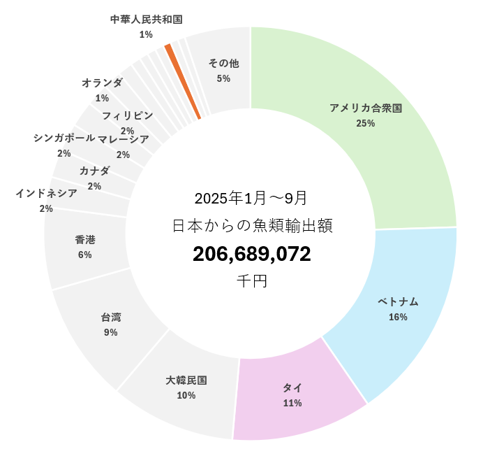 2025年1月~9月小計の日本からの魚類輸出額の国別内訳をみると、アメリカ向けが506億円(24.5%)でトップ、次いで、ベトナム向けの328億円(15.9%)、そして、タイ向けの228億円(11.0%)と続く。一方、輸出量でみると、タイ向けが12万トンでトップ、次いで、ベトナムの10万トンそして、インドネシア向けの3万トンと続く。中国向けは、13億円(204トン)のみ