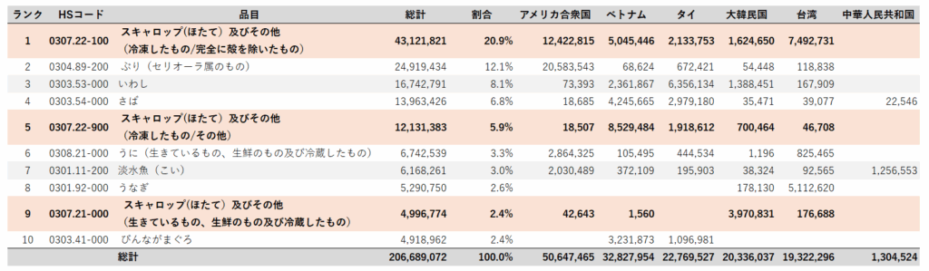 次に2025年1月から9月小計の輸出額の品目毎トップ10をみてみると、ホタテ(冷凍、殻をむいたもの)が431億円(20.9%)で一番多く、次に、ぶりの249億円(12.1%)と続く。ホタテは、冷凍や生きているもの等合わせると、602億円(29.2%)となり、非常に重要な輸出品目であることが分かる。