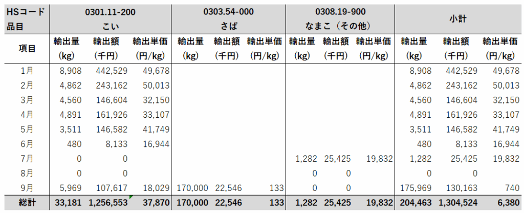 2025年1月~9月 日本から中国への魚類輸出状況