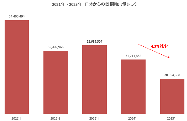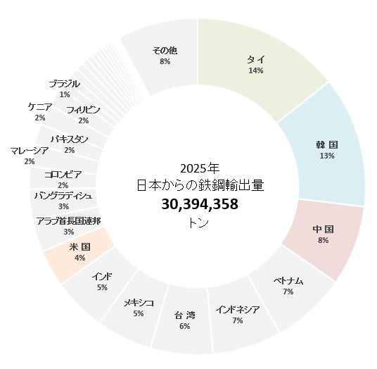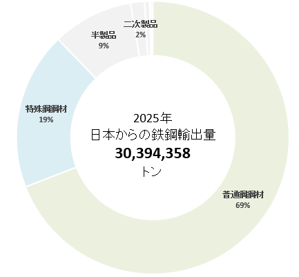 - 2025年の輸出の種類別では、普通鋼鋼材が2,101万トン(69%)でトップ