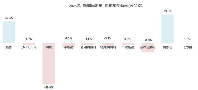 - 2025年の輸出量の2024年との変動率では、鋼塊がマイナス69.9%と一番減少。