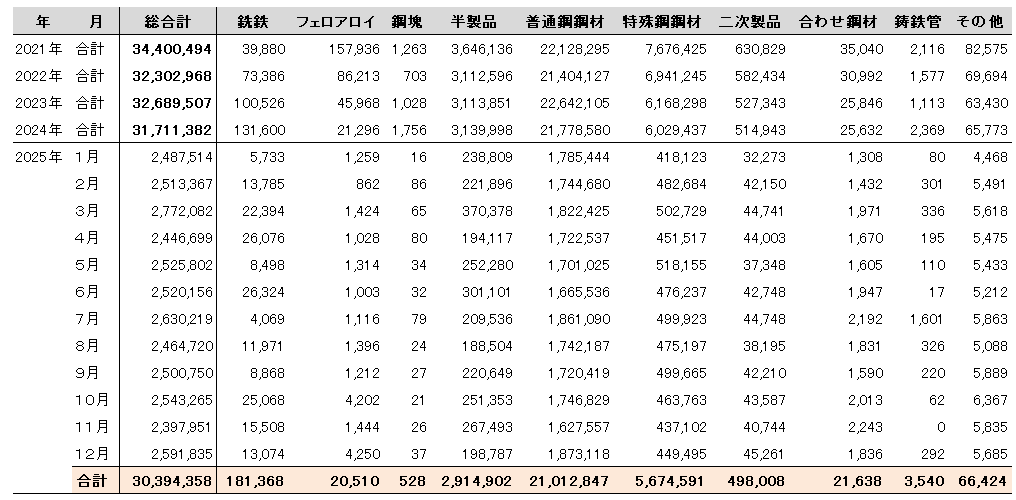 2021年~2025年 日本からの鉄鋼輸出量推移(トン)(種類別)
