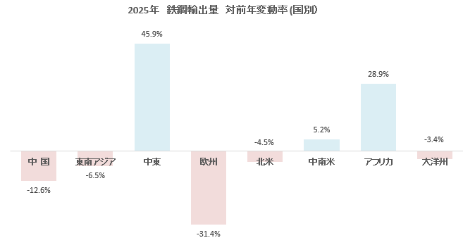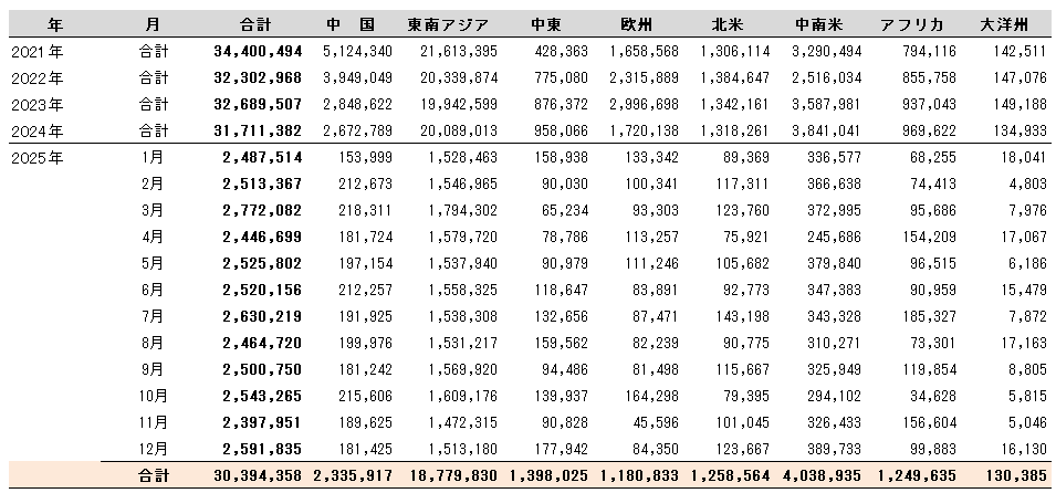 - 2025年の輸出量の2024年との変動率でみると、中東向けが45.9%、中南米向けが5.2%、アフリカ向けが28.9%増加。